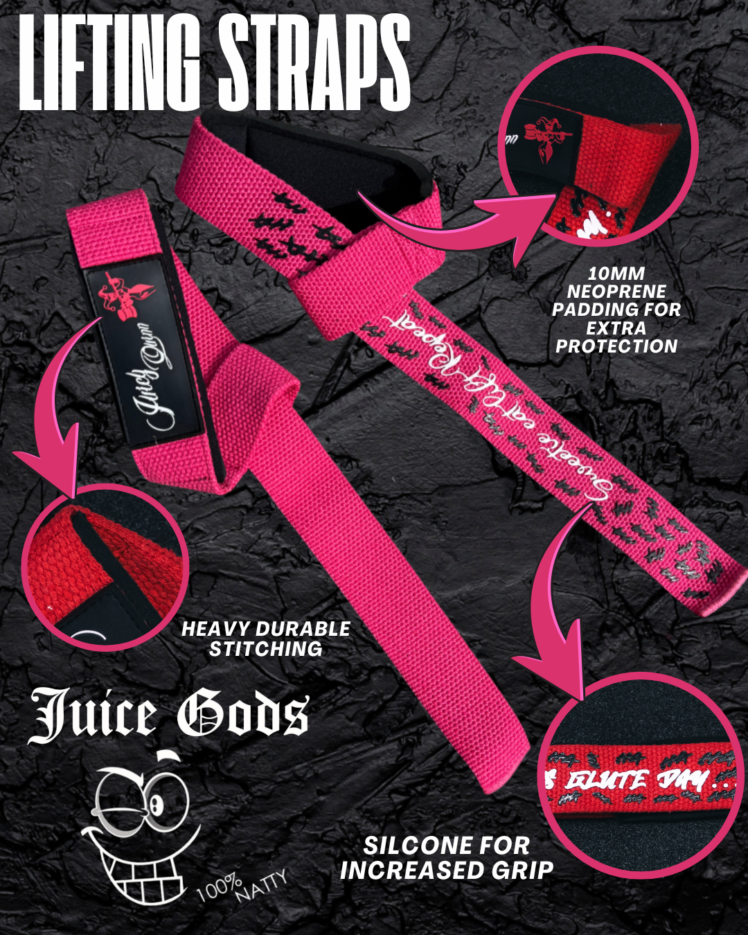 Juice Gods Premium Lifting Straps are made from 100% Cotton, created to ensure an unbreakable grip for all pulling exercises.